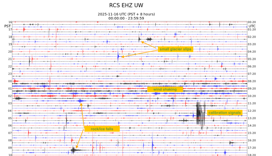 Recently there has been a false report circulating that Mt. Rainier is suddenly showing seismic tremor activity — The report is not true. The signal being referenced is actually radio interference, most likely due to rime ice buildup on the antenna of one of our seismic stations. That station, STAR, is one of the last remaining old analog sites on the mountain and uses very low-power radio transmission to send data down to a receiver site. This older, low-power system is susceptible to weather-related interference and the recent stormy weather is certainly the culprit. There is currently no unusual seismic activity at Mount Rainier.