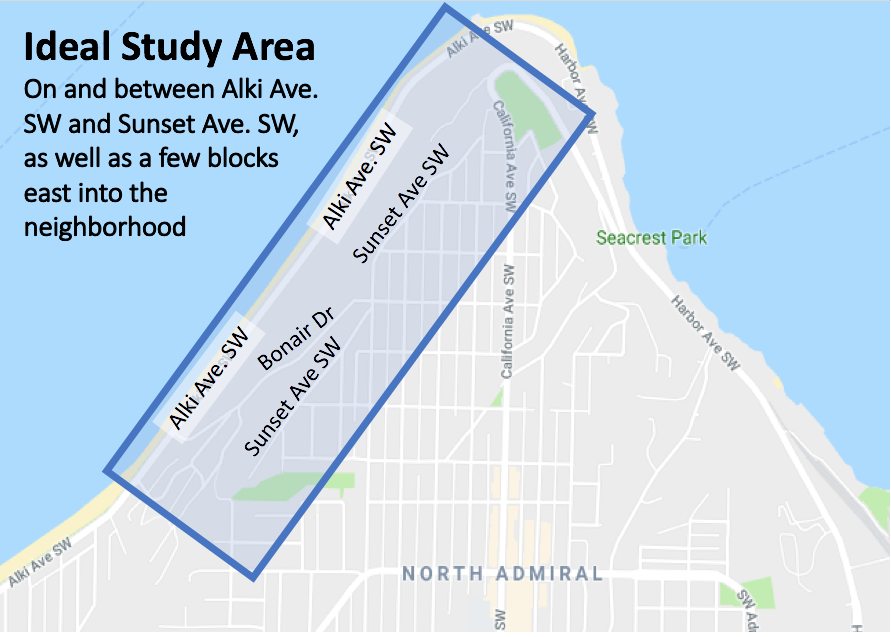 For our experiment, we are looking for hosts in West Seattle living near the bluffs along Alki. Ideally, hosts would live on or between Sunset Ave. SW and Alki Ave. SW. We also need a few sites in the neighborhood away from the sea bluff (see the map below). The experiment itself will last just 1 day, and only requires access to your yard, where we will plop-down a coffee-can sized seismometer for a few hours. The experiment will take place some time between early October and late November.
