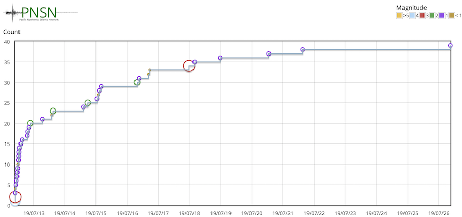 Cumulative number of aftershocks starting with main shock, July 12, 09:51 Z up to July 26 2019 Z.
