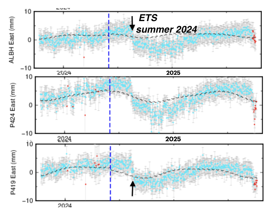 Below I show the final map for this ETS event color coded by time (earliest- blue, latest- red) and also mark the location with black polygons of three geodetic (GPS) stations with good data for the last two years. Below the map I show the East-West displacement for these station. Note that the ETS of summer a year ago (Aug 6 - Sep 6, 2024) shows a clear offset at these three station (marked with black arrows). The dashed blue vertical line marks the time of a physical change to the instrument that may or may not cause an offset. It looks to me that there is a similar but maybe smaller offset at the end of these records for the current ETS. Note that the values plotted in red indicate preliminary calculations. Once all satellite orbit and baseline corrections are made to the data these most recent offsets may change slightly.