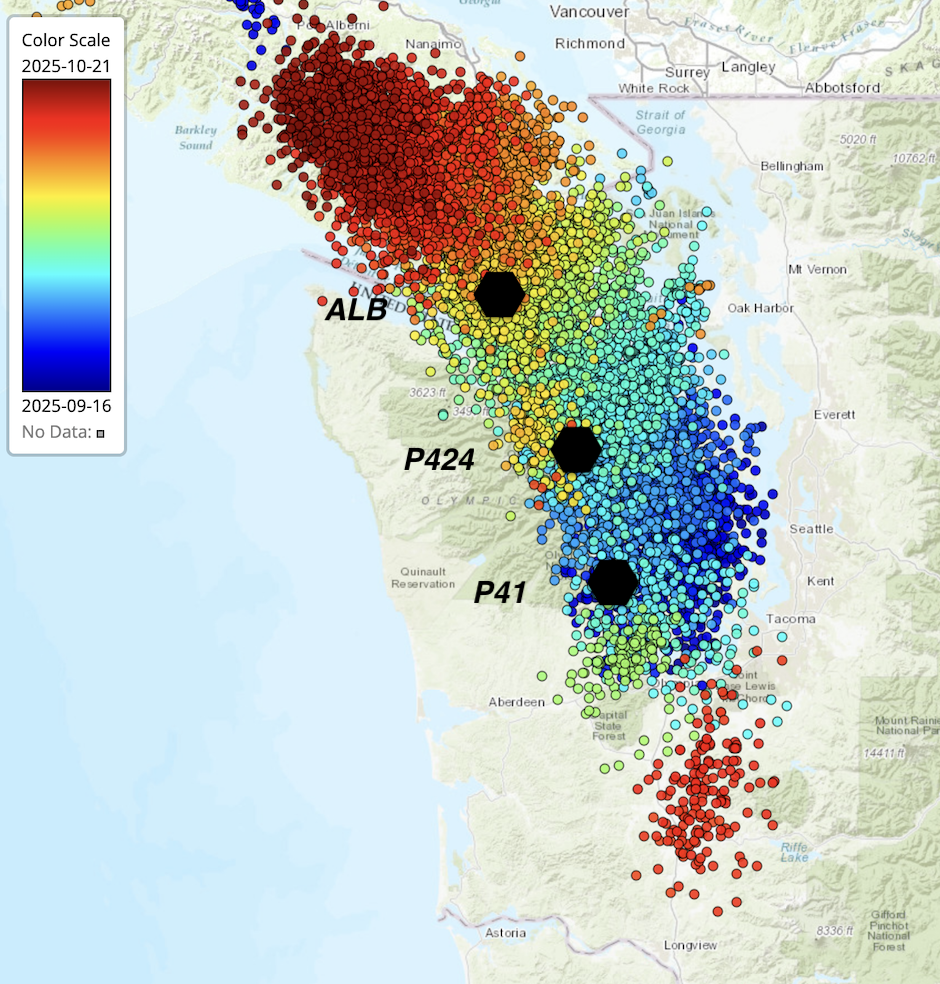 Oct. 21, 2025 - I think this ETS is over. The last couple of days have had very little weak tremor within the normal Northern Washington-Southern Vancouver Island zone. It lasted about 35 days, which is near the average for this zone when tremor didn't extend into the central Vancouver Island area or to southern Washington. There doesn't seem to be anything unusual about this ETS. The number of tremor locations detected during this period was about 12,000, which is also fairly typical of similar ETS events here.
